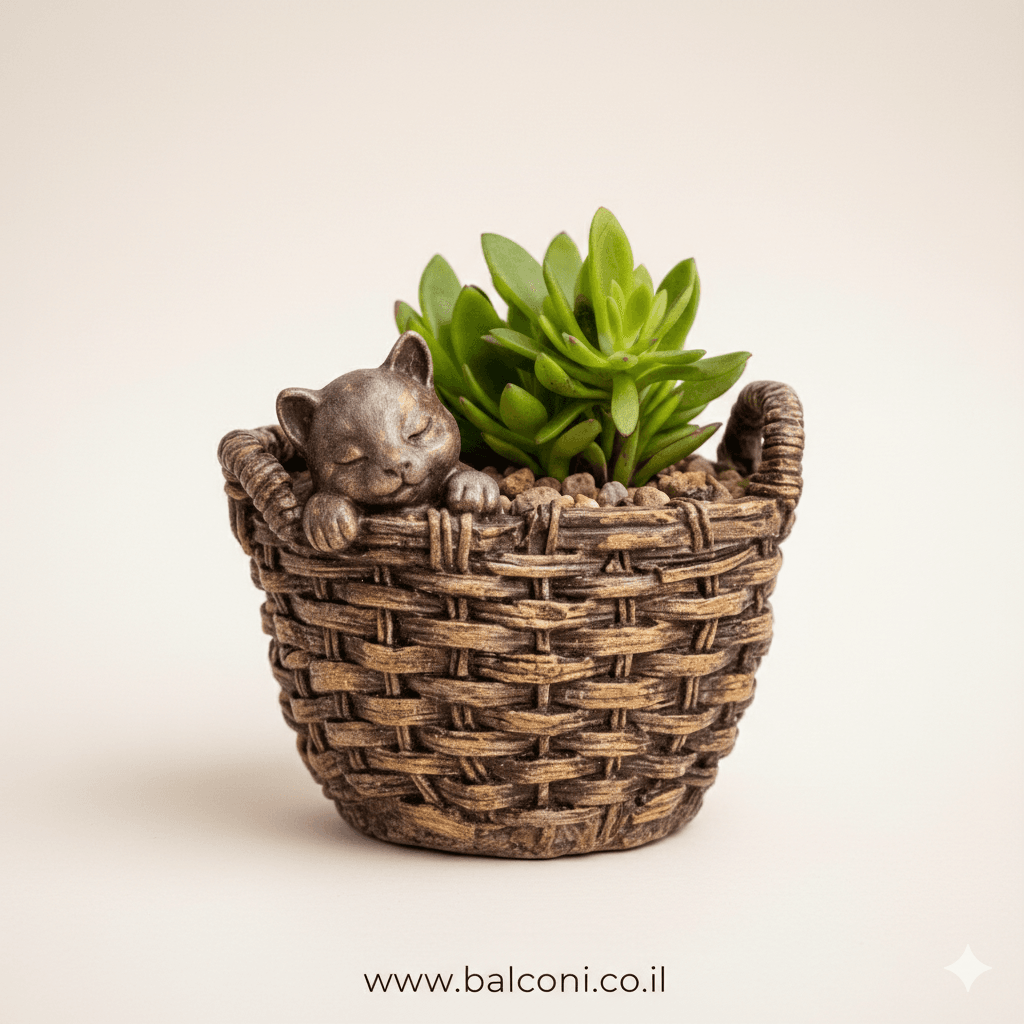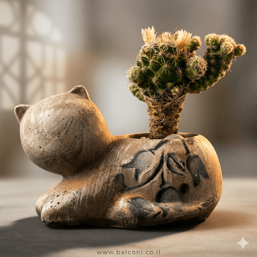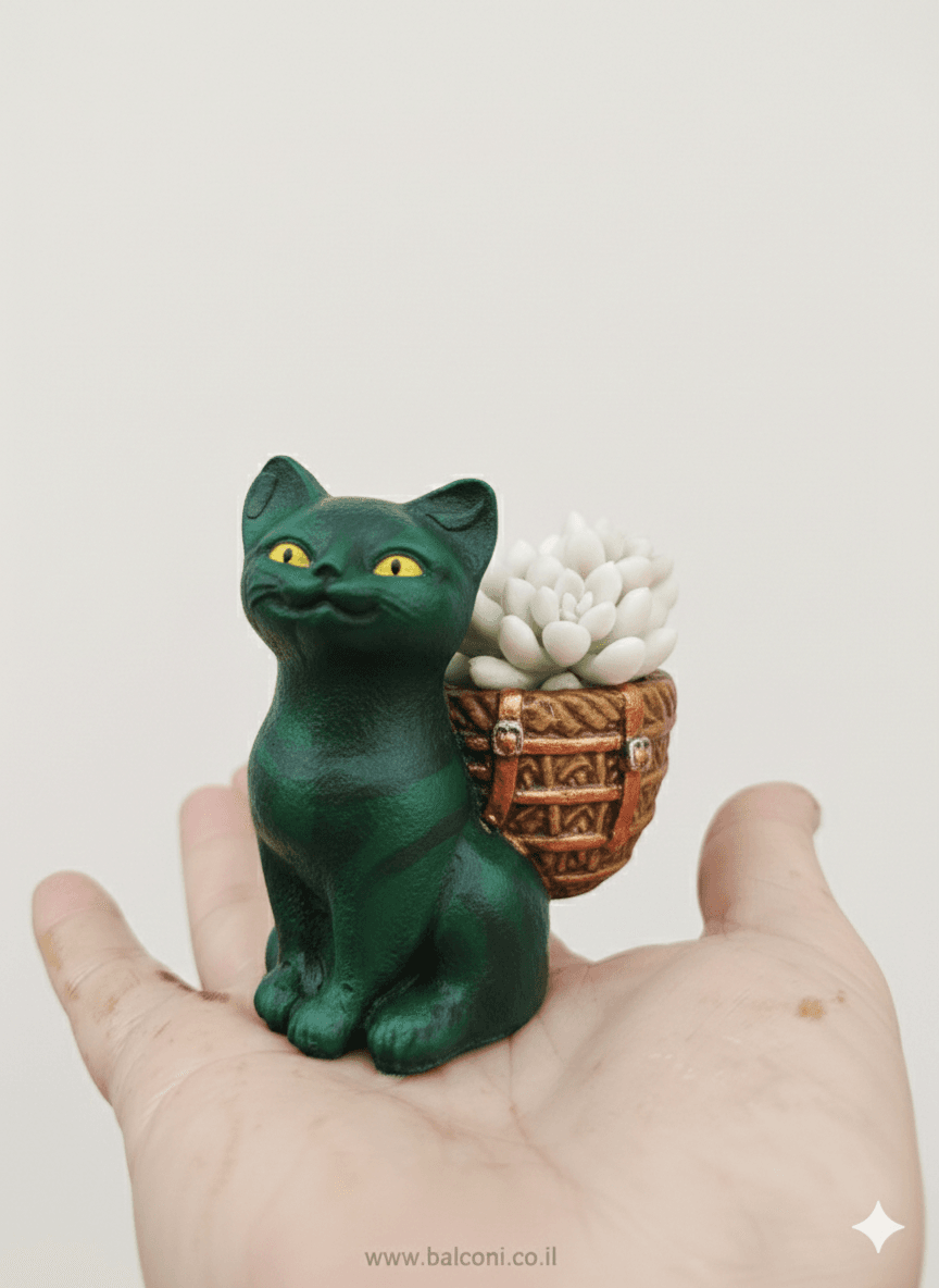 יצירת בטון בעבודת יד בצורת חתול 🐈, משולבת בצמחייה עמידה וחיפוי אבנים יפות. החתול מגיע עם תחתית תואמת. ניתן לבחור את גוון יצירת הבטון ומתוך מבחר גדול של סוקולנטים. 🌵