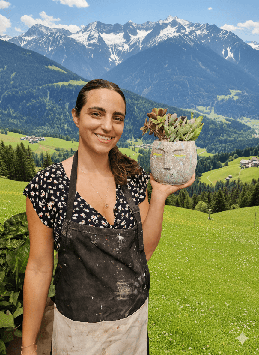 יצירת בטון בעבודת יד עם דוגמת פנים. באיסוף עצמי ניתן לקבל את יצירת הבטון בשלל צבעים, במשלוח תשלח יצירת הבטון בצבע אפור בתוספת צמחייה מהממת וחיפוי אבנים יפות.