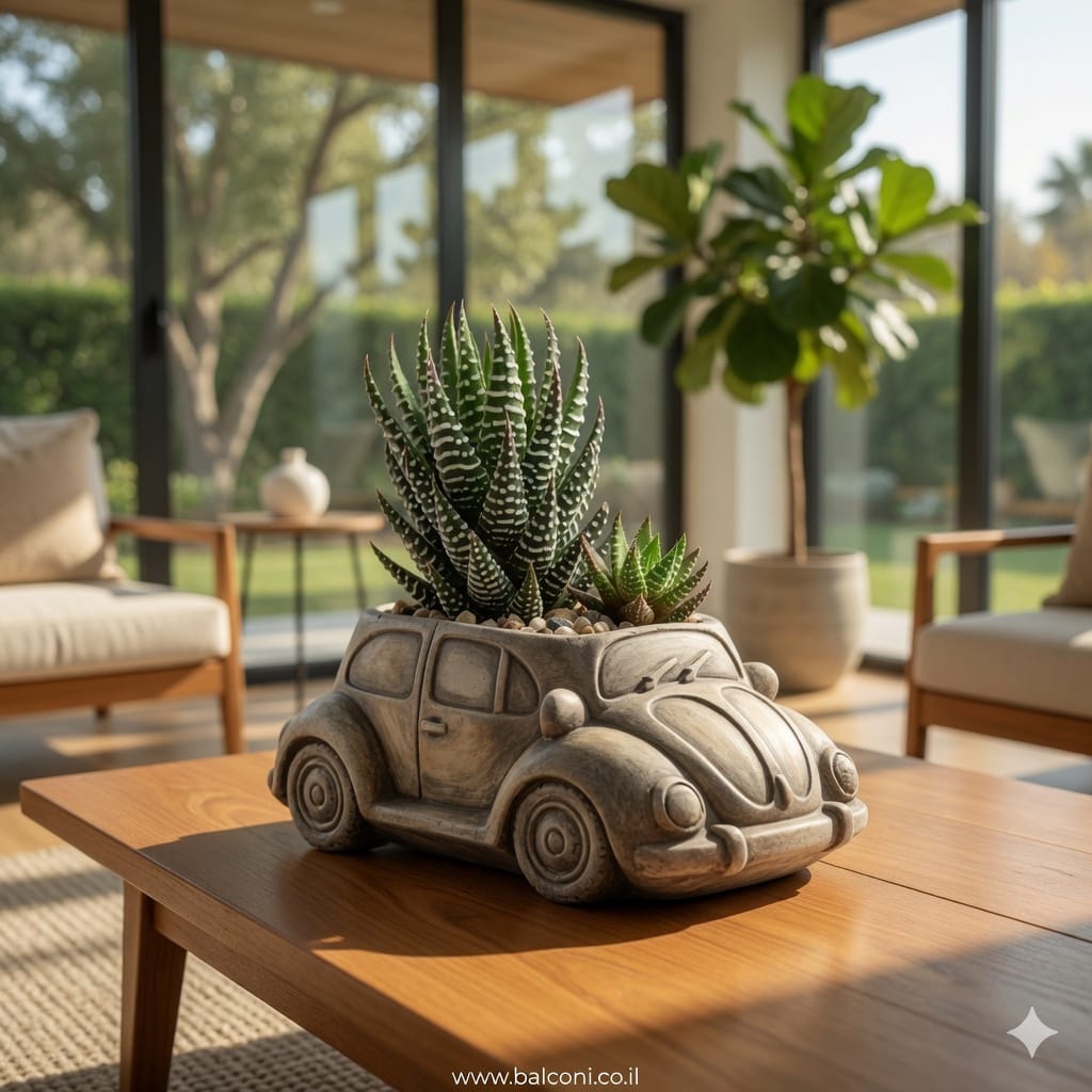 יצירת בטון בעבודת יד בצורת אוטו מסוג חיפושית 🐞. באיסוף עצמי ניתן לקבל את יצירת הבטון בשלל צבעים, במשלוח תשלח יצירת הבטון בצבע אפור בתוספת צמחייה מהממת וחיפוי אבנים יפות.
