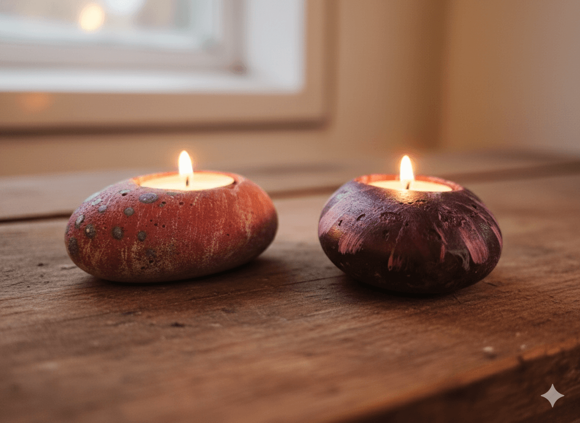 מעמד לנר בהשראת חלוק נחל עם ציור בעבודת יד באמצעות שבלונה.