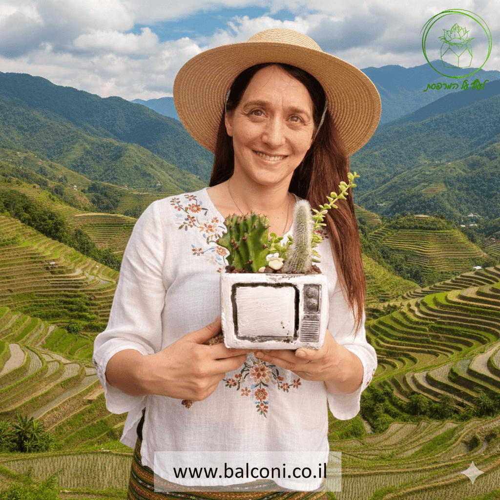 יצירת בטון בעבודת יד בצורת טלויזיה. באיסוף עצמי ניתן לקבל את יצירת הבטון בשלל צבעים, במשלוח תשלח יצירת הבטון בצבע אפור בתוספת צמחייה מהממת וחיפוי אבנים יפות.