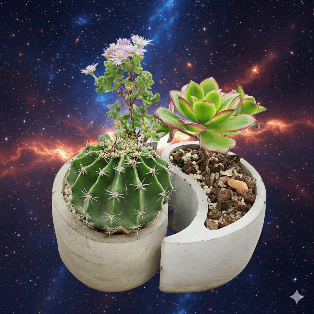 יצירת בטון בעבודת יד בצורת יין ויאנג. באיסוף עצמי ניתן לקבל את יצירת הבטון בשלל צבעים, במשלוח תשלחנה יצירות הבטון בצבע אפור בתוספת צמחייה מהממת וחיפוי אבנים יפות, המחיר כולל שני יצירות.