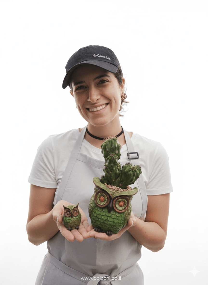 יצירת בטון בעבודת יד בצורת ינשוף. באיסוף עצמי ניתן לקבל את יצירת הבטון בשלל צבעים, במשלוח תשלח יצירת הבטון בצבע אפור בתוספת צמחייה מהממת וחיפוי אבנים יפות.