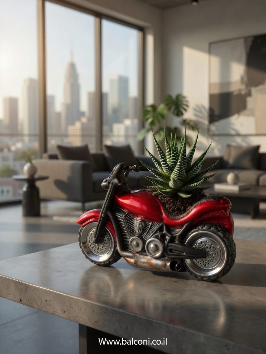 יצירת בטון בעבודת יד בצורת אופנוע. באיסוף עצמי ניתן לקבל את יצירת הבטון בשלל צבעים, במשלוח תשלח יצירת הבטון בצבע אפור בתוספת צמחייה מהממת וחיפוי אבנים יפות.